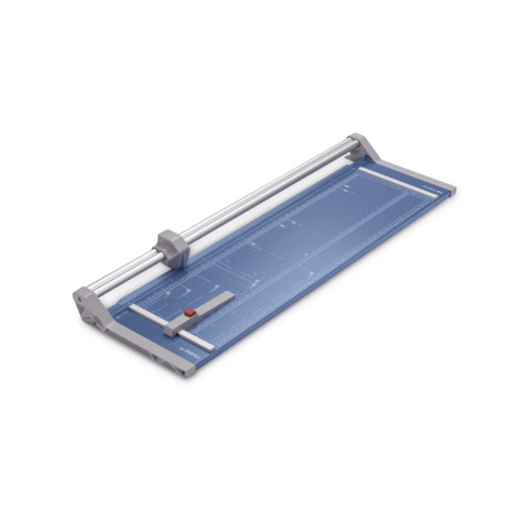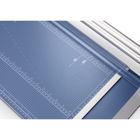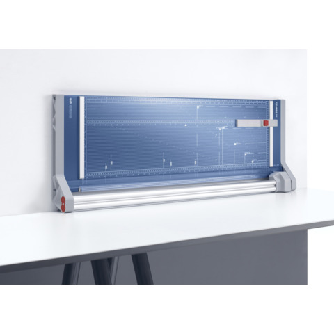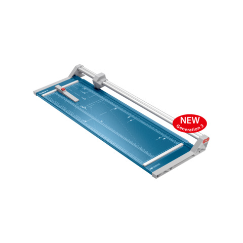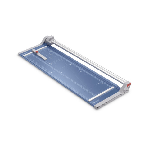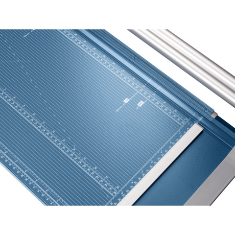 Rollenschneider Dahle 556. Stabiler Metalltisch mit rutschfesten Gummifüssen. Formatlinien mit cm/inch-Einteilung, Foto-und DIN-Formate. Beidseitige Winkelanlagen und Linealorientierung. Exakt positionierbarer Rückanschlag und doppelte Führungsstange. Rückseitige Standfüsse. Automatische Pressung. Max. Papierformat: DIN A1. Geschliffenes Rund- und Untermesser aus gehärtetem Stahl, Sicherheit durch Rundmesser im geschlossenen Kunststoffkopf, Gewicht: 6,4 kg. Farbe: blau. Tischgröße (B x T): 395 x 1180 mm. Länge des Schnittes: 960 mm. Max. Stärke des Stapels je Schnittarbeitsgang: 1.0 mm. Max. Anzahl der Blätter (80g/qm) je Schneidearbeitsgang: 20 Blatt. Garantie gewährt. Garantiedauer: 5 Jahre (ausgenommen Verschleißteile). GS-Prüfzeichen.