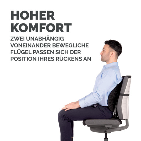 Rückenstütze Back Angel(TM). Unterstützt den gesamten Rücken, ideal für längeres Sitzen. Besteht aus 2 einzelnen beweglichen Flügeln. In 7 Höhen zwischen 14 und 23cm verstellbar. Elastische und flexible Befestigung, luftdurchlässigen Öffnungen, modernes Design. Größe (H x B x T): 380 x 440 x 140 mm. Farbe: schwarz.