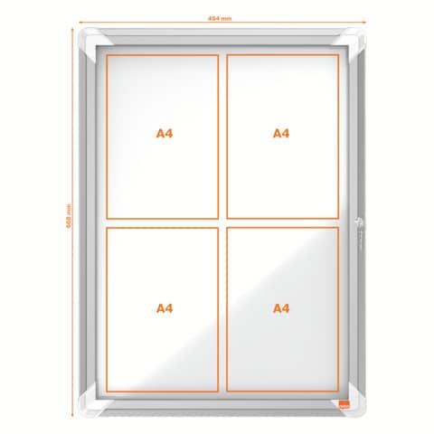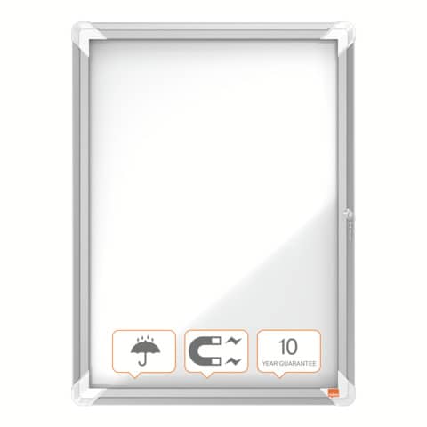Nobo Schaukasten Premium Plus. Für den Außenbereich. Für 4 x DIN A4. Magnetisch. Mit abschließbarer Klapptür aus Sicherheitsglas. Wetterfest, mit speziellen Dichtungen (IEC 60529). Mit magnetischer Metallrückwand. Für die Verwendung von Magneten und trocken abwischbaren Markern. Mit Sicherheitsschloß an der Seite. Nutzbare Tiefe: 16 mm. Lieferung inklusive Wandbefestigung und 2 Schlüsseln. Material Rahmen: Aluminium. Material Tür: Sicherheitsglas, 4 mm. Format: 530 x 690 x 45 mm. 10 Jahre Garantie. Farbe: weiß.