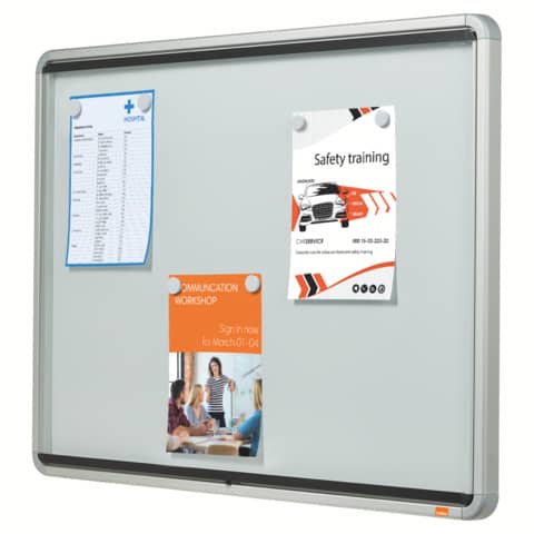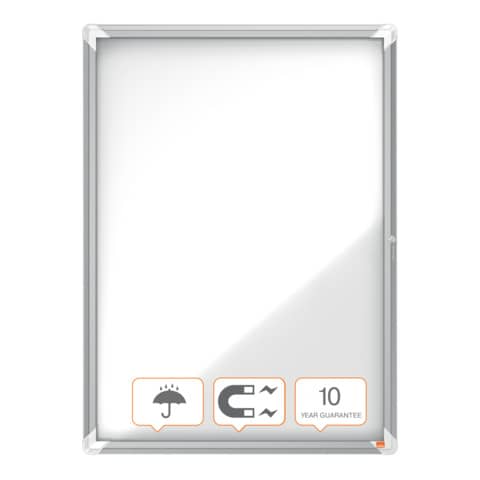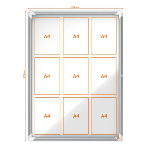 Nobo Schaukasten Premium Plus. Für den Außenbereich. Für 9 x DIN A4. Magnetisch. Mit abschließbarer Klapptür aus Sicherheitsglas. Wetterfest, mit speziellen Dichtungen (IEC 60529). Mit magnetischer Metallrückwand. Für die Verwendung von Magneten und trocken abwischbaren Markern. Mit Sicherheitsschloß an der Seite. Nutzbare Tiefe: 16 mm. Lieferung inklusive Wandbefestigung und 2 Schlüsseln. Material Rahmen: Aluminium. Material Tür: Sicherheitsglas, 4 mm. Format: 708 x 969 x 43 mm. 10 Jahre Garantie. Farbe: weiß.