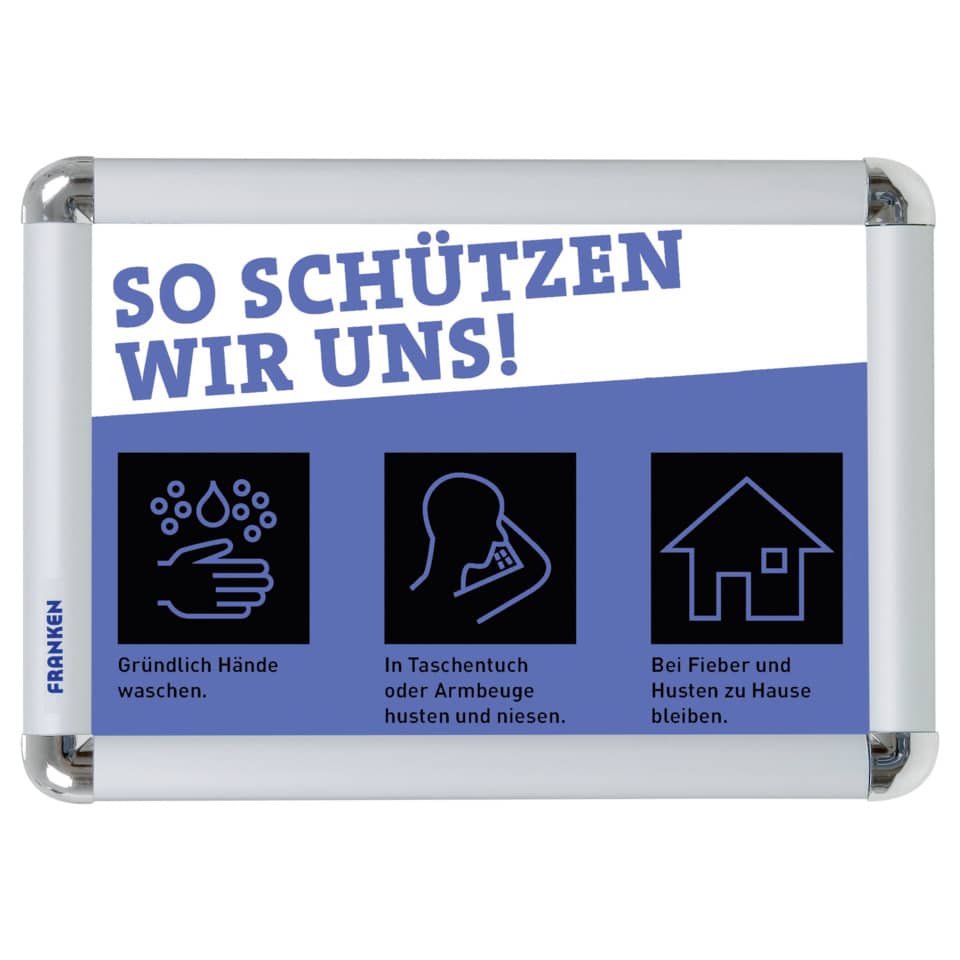 FRANKEN Wechselrahmen. Für DIN A4. Mit Klemmprofiltechnik für einfaches und schnelles Wechseln der Aushänge. Mit transparenter Antireflex-Schutzfolie (PP) mit UV-Filter. Mit Polystyrol-Rückwand. Lieferung inklusive Montagematerial. Material Rahmen: silber eloxiertes Aluminiumprofil 25 mm. Format: 240 x 327 x 12 mm. Farbe: silber.