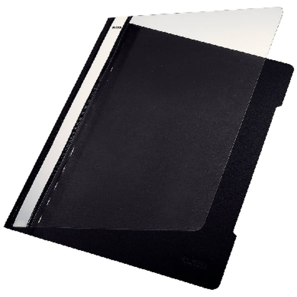 Leitz Plastik-Hefter Standard, mit transparentem Vorderdeckel, Heftmechanik 8 cm und langem Beschriftungsfeld. Greifausschnitt am Rückdeckel, ohne Falz. Material: reissfeste PVC-Folie. Kapazität: bis zu 120 Blatt A4. Format: 233 x 310 mm. Farbe: schwarz.