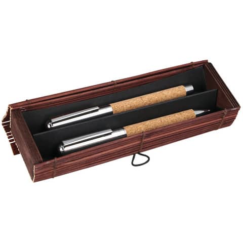 Kugelschreiber und Rollerball alsSet verpackt, mit natürlichem Cork,blau schreibend, in der Bamboo Box
