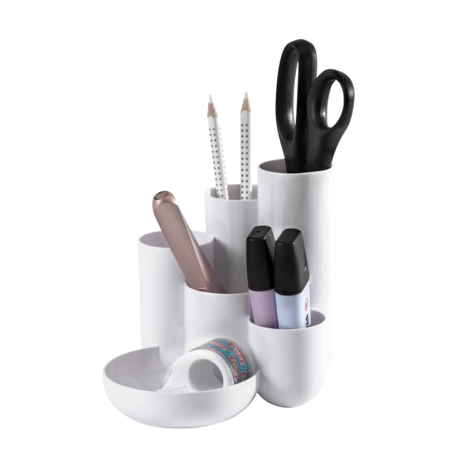 Schreibtischköcher CAMPUS mit 5 in Höhe und Durchmesser unterschiedlichen Röhren und 1 flachen Schale zur Kleinteile-Organisation. Die moderne Interpretation eines Büroklassikers – zeitgemäßes Design trifft auf hohe Qualität. Der elegante Schreibtischköcher eignet sich zur Organisation und Ablage von Schreibtisch, Beauty- oder Künstlerbedarf. Die glänzenden Oberflächen harmonieren mit den geschwungenen Formen. In den 5 Röhren finden auch längere und/oder schwere Gegenstände einen sicheren Stand. Kleinteile lassen sich perfekt in der Schale unterbringen. Die große Grundfläche sorgt auch in gefülltem Zustand für einen sicheren Stand. Made in Germany. Außenmaße (Ø x H) 180 x 137 mm. Material: hochwertiger Kunststoff, Polystyrol (PS). Farbe: weiß.