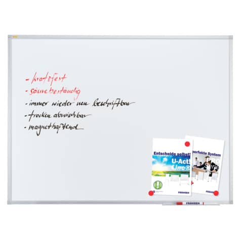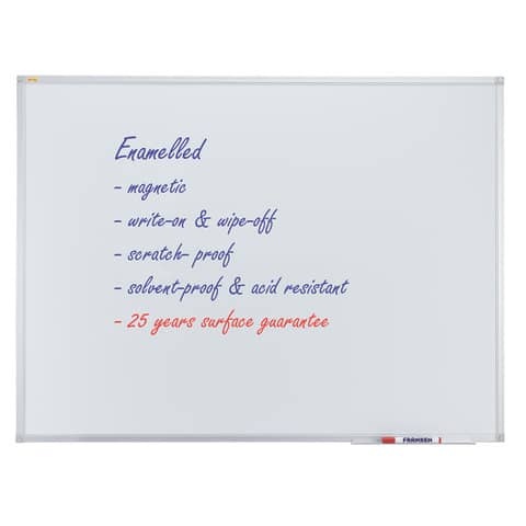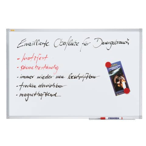 FRANKEN Whiteboard X-tra!Line Emaille. Magnethaftend, beschriftbar. Zur Verwendung im Hoch- oder Querformat. Mit Ablageschale. Trocken abwischbar, kratzfest und säurebeständig. Lieferung inklusive Montagematerial. Wandbefestigung: Spiegelaufhängung oder durch die Ecken. Oberfläche/Material: Emaille. Rahmen: silber eloxiertes Aluminium 12mm stark, 20mm breit, mit hellgrauen Kunststoffecken. Format: 2400 x 1200 mm. 25 Jahre Garantie auf die Oberfläche. Farbe: weiß.