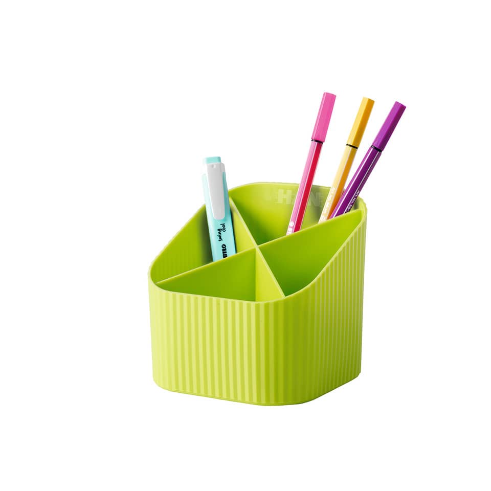 Schreibtischköcher HAN Re-X-LOOP. Nachhaltiger Schreibtischköcher aus qualitativ hochwertigem, recyceltem Öko-Kunststoff, im formschönen Design sorgt für Ordnung auf dem Schreibtisch. Die 4 unterschiedlich hohen Fächer bieten viel Platz für Stifte, Pinsel und viele weitere Utensilien. Ob für das Büro oder Zuhause. Der HAN Re-X-LOOP ist unempfindlich, stabil und langlebig. Ausgezeichnet mit dem Designpreis "Produkt des Jahres". Der Schreibtischköcher HAN Re-X-LOOP ist umweltfreundlich und hilft somit wertvolle Ressourcen zu sparen. Made in Germany. Außenmaße (B x T x H): 111 x 111 x 105 mm. Material: 100% PIR-Kunststoff Rezyklat (PP). Farbe: lemon.