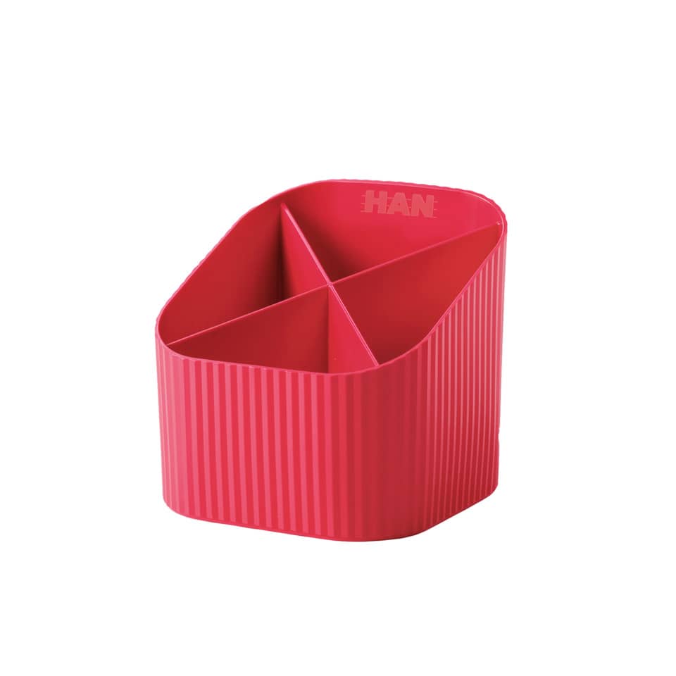 Schreibtischköcher HAN Re-X-LOOP. Nachhaltiger Schreibtischköcher aus qualitativ hochwertigem, recyceltem Öko-Kunststoff, im formschönen Design sorgt für Ordnung auf dem Schreibtisch. Die 4 unterschiedlich hohen Fächer bieten viel Platz für Stifte, Pinsel und viele weitere Utensilien. Ob für das Büro oder Zuhause. Der HAN Re-X-LOOP ist unempfindlich, stabil und langlebig. Ausgezeichnet mit dem Designpreis "Produkt des Jahres". Der Schreibtischköcher HAN Re-X-LOOP ist umweltfreundlich und hilft somit wertvolle Ressourcen zu sparen. Made in Germany. Außenmaße (B x T x H): 111 x 111 x 105 mm. Material: 100% PIR-Kunststoff Rezyklat (PP). Farbe: rot.