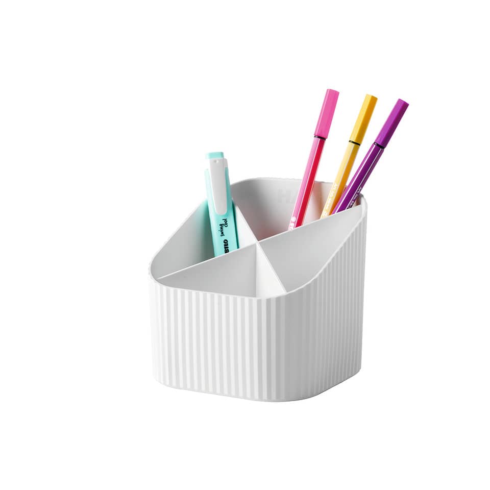 Schreibtischköcher HAN Re-X-LOOP. Nachhaltiger Schreibtischköcher aus qualitativ hochwertigem, recyceltem Öko-Kunststoff, im formschönen Design sorgt für Ordnung auf dem Schreibtisch. Die 4 unterschiedlich hohen Fächer bieten viel Platz für Stifte, Pinsel und viele weitere Utensilien. Ob für das Büro oder Zuhause. Der HAN Re-X-LOOP ist unempfindlich, stabil und langlebig. Ausgezeichnet mit dem Designpreis "Produkt des Jahres". Der Schreibtischköcher HAN Re-X-LOOP ist umweltfreundlich und hilft somit wertvolle Ressourcen zu sparen. Made in Germany. Außenmaße (B x T x H): 111 x 111 x 105 mm. Material: 100% PIR-Kunststoff Rezyklat (PP). Farbe: weiß.