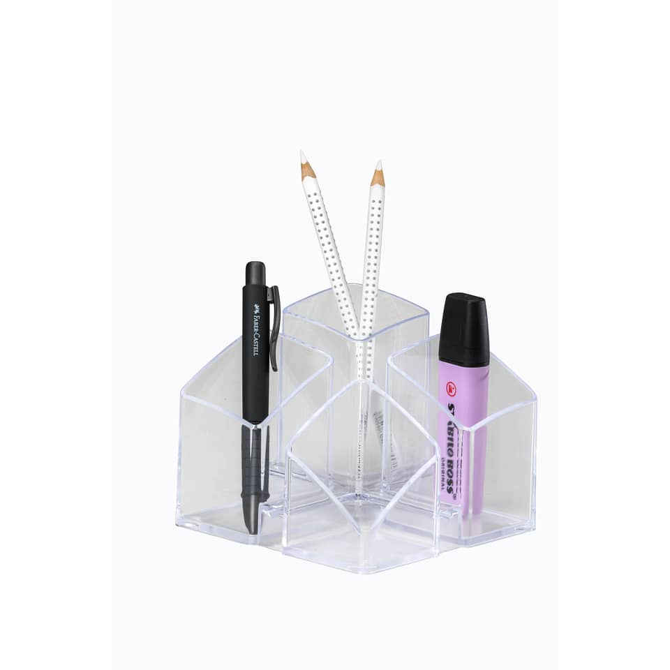 Schreibtischköcher SCALA. Exklusives Design trifft auf Funktion. Hochglänzende Farbe. Hochwertiger Schreibtischköcher mit 4 Fächern inkl. Brief- und Kartenfach. Die 4 Fächer mit unterschiedlichen Höhen bieten eine optimale Unterbringung und Übersicht Ihrer Büroutensilien. Individuell kombinierbar und erweiterbar. Robust, standfest und stabil. Rutschfest durch möbelschonende Gummifüße. Made in Germany. Außenmaße (B x T x H): 125 x 125 x 100 mm. Material: hochwertiger Kunststoff, Polystyrol (PS). Farbe: transparent-glasklar.