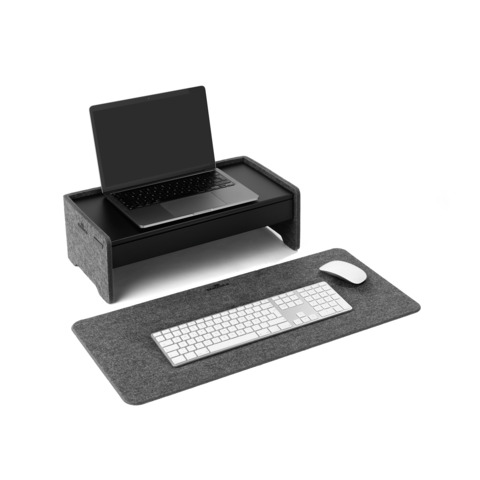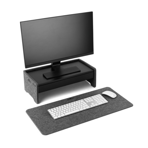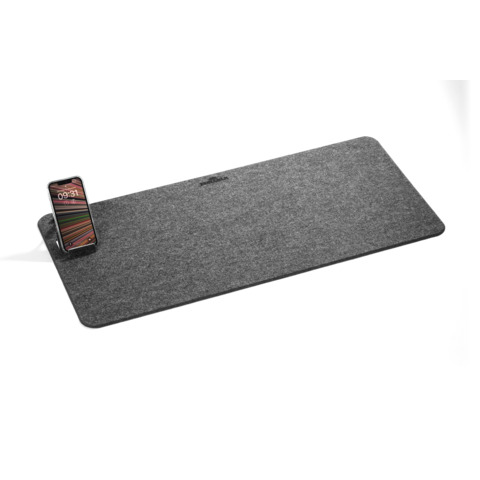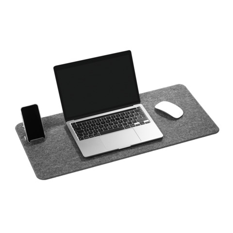 Schreibunterlage EFFECT. Ausführung: 60% recycelter PET-Filz. Mit ausklappbarem Handyhalter, auf die Hälfte zusammenklappbar, leicht zu reinigen, absorbiert störende Geräusche. Größe (B x H): 700 x 330 mm. Stärke: 4 mm. Farbe: anthrazit.