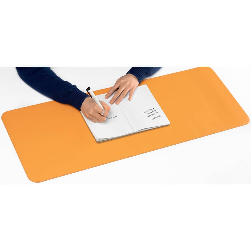 Die einrollbare Schreibunterlage im Format 80 x 30 cm, hochwertiges Lederimitat in gelb, grau, ist doppelseitig nutzbar, wasserfest und sehr leicht zu reinigen. Mit ihrer edlen Optik und der zweiseitigen Nutzbarkeit (2-farbig) ist diese Schreibtischunterlage ein dekorativer Eyecatcher auf jedem Schreibtisch. Papierblätter lassen sich auf der Schreibunterlage angenehm beschreiben. Zudem ist die Oberfläche aus hochwertigem Material für alle Maustypen geeignet. Praktisch: Die extralange Breite ersetzt sogar ein Mauspad. Die stabile, rutschfeste Schreibtischunterlage liegt absolut plan auf und es entstehen keine umgeknickten Ecken. An der designstarken und hochwertigen SIGEL Schreibunterlage haben Sie lange Freude.