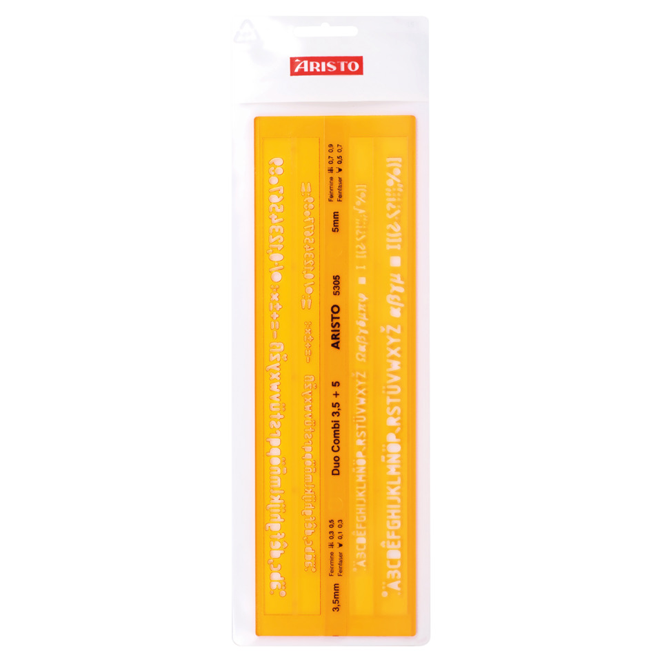 ARISTO maßbeständige, formstabile Präzisions- Schriftenschablonen sind aus kontrasterhöhendem orange-transparentem Kunststoff gefertigt, mit randscharfen Buchstaben, Ziffern, Interpunktionen und Symbolen versehen und ideal geeignet für Anwendungen im Schul- und Ausbildungsbereich. Die ARISTO Duo-Kombi-Schriftenschablone in Mittelschrift (gerade Schrift) mit zwei Schrifthöhen 3,5 und 5mm ist für Pigmentliner und Feinminenstifte bestens geeignet. Im Format 245 x 75mm entspricht die Schablone den Normen ISO 3098/1, DIN 6776 und den Normen für Microverfilmung.