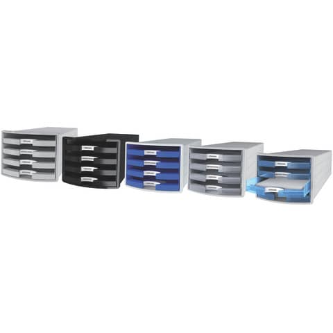 Schubladenbox IMPULS mit neuem, modernen Gehäusedesign mit 4 offenen, großzügigen Schubladen für Papierformate DIN A4/C4. Innovatives, attraktives Design in höchster Qualität. Inkl. großer auswechselbarer Beschriftungsschilder mit hochwertiger Klarsichtabdeckung für ein einfaches Auffinden von Unterlagen. Leichtlaufende Schubladen mit Auszugssperre und durchgängig geschlossenem Boden auch zur Kleinteile Organisation geeignet. Extra stabile Gehäuseausführung mit optimierter Stapeltechnik. Rutschfeste, möbelschonende Gummifüße sorgen für einen sicheren Stand. Made in Germany. Außenmaße (B x T x H): 280 x 367 x 235 mm. Innenmaße der Schubladen (B x T x H): 240 x 325 x 25 mm, daher ein hohes Fassungsvolumen. Material: hochwertiger Kunststoff, Polystyrol (PS). Farbe des Gehäuses: lichtgrau. Farbe der Schubladen: lichtgrau.