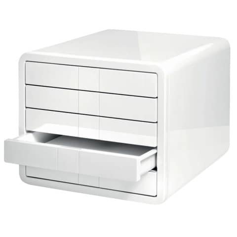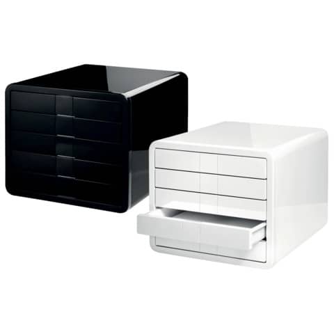 Schubladenbox i-BOX mit 5 geschlossenen Schubladen für Papierformate DIN A4/C4 in Premium-Qualität. Einzigartiges, zeitloses, elegantes und innovatives Design in hochglänzender Ausführung für den gehobenen Anspruch in einem repräsentativen Umfeld. Besonders leichtlaufende Schubladen mit Auszugssperre und Griffloch für ein bequemes Entnehmen. Neues Beschriftungskonzept mit einer innovativen Clip-Mechanik. Inkl. Beschriftungsschildern. Rutschfeste, möbelschonende Gummifüße sorgen für einen sicheren Stand. Made in Germany. Außenmaße (B x T x H): 295 x 355 x 247 mm. Innenmaße der Schubladen (B x T x H): 244 x 325 x 33 mm. Material: hochwertiger Kunststoff (ABS). Farbe des Gehäuses: weiß. Farbe der Schubladen: weiß.