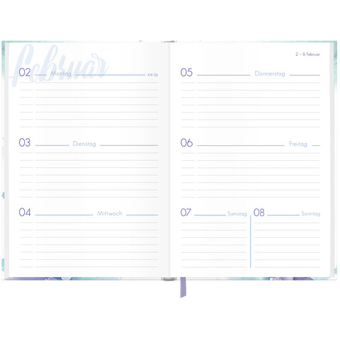 Flexocover: Robustes und flexibles Cover, das nicht nur gut aussieht, sondern auch gut in der Hand liegt und vor Abnutzung schützt. Lesebändchen: Praktisches Lesebändchen, um schnell zu Ihrer aktuellen Woche oder wichtigen Notizen zu gelangen.