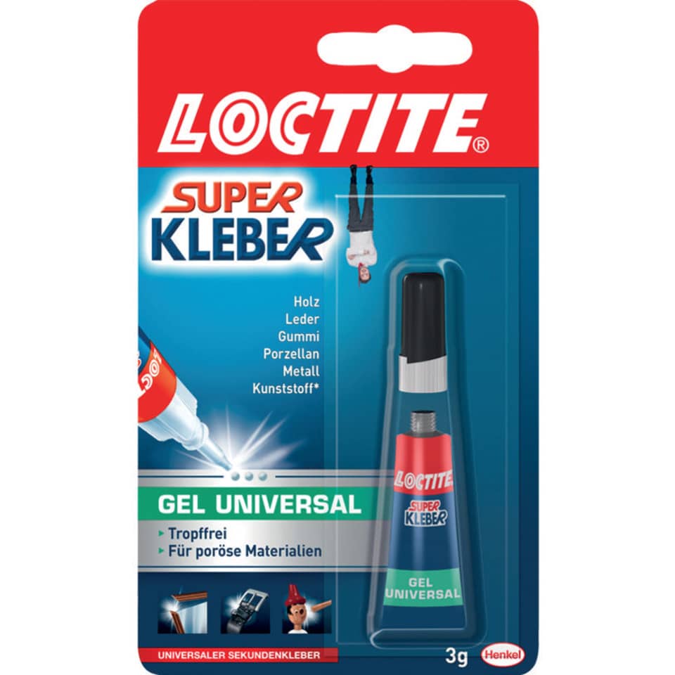 Sekundenkleber (Büro, Basteln) Loctite® Superkleber Gel Universal, ohne Lösungsmittel, ideal für senkrechte Flächen und, poröse Materialien, transparent, Produktverwendung: Leder, Gummi, Holz, Metall, Porzellan, Papier u, Kunststoff, Kategorie der Anfangshaftung: extrem hoch, Typbezeichnung des Spezialverschlusses: Pin-Verschluss gegen Verkleben der Spitze, Behälterart/-inhalt: Tube, auf Blisterkarte mit 3 g