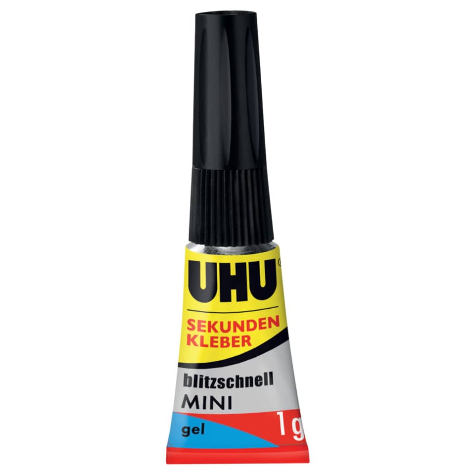 UHU SEKUNDENKLEBER blitzschnell MINIS gel. Extrem starker Sekundenkleber- portioniert in 1 g Tuben, in der praktischen Aufbewahrungsbox. Optimale Qualität für jede Anwendung- 3x siegelfrisch. Aufgrund seiner gelartigen Konsistenz ermöglicht dieser Sekundenkleber ein tropffreies und sauberes Arbeiten, auch an senkrechten Flächen. Ideal für poröse Materialien. Spülmaschinenfest und wasserresistent (bei sachgemäßer Anwendung). Produktverwendung: klebt Porzellan, Keramik, viele Kunststoffe (z.B. PVC, ABS), Metall, Gummi, Holz, usw.. Nicht geeignet für Styropor®, Bekleidungstextilien/-leder, PE, PP. Aufbewahrungsbox mit 3 Tuben à 1g. Infokarte.