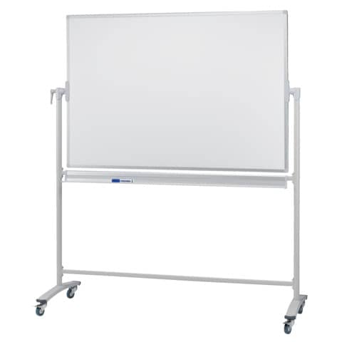 FRANKEN Whiteboard Mobil mit Drehfunktion Stahl. Doppelseitige Schreibtafel. Beidseitig beschriftbar. Die horizontale Drehachse ist um 360° schwenkbar und stufenlos arretierbar. Zweiarmfuß mit 4 feststellbaren Lenkrollen, 600 mm tief. Trocken abwischbar. Mit Ablageschale. Material: Gestell: Metall, lichtgrau. Oberfläche: Stahl. Rahmen: silber eloxiertes Aluminium mit hellgrauen Kunststoffecken. Tafelformat: 1500 x 1000 mm. Gesamthöhe: 1930 mm. Farbe: weiß.
