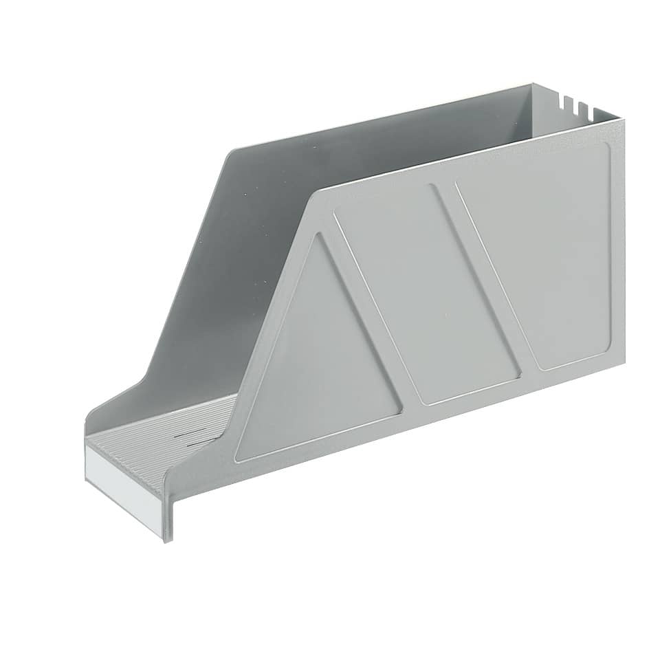 Leitz Stehsammler Standard, A4, zum Abstellen auf einfachen Fachböden. Boden ohne Führungsstege (Tiefe mindestens 33 cm), Boden geriffelt, vorne mit Greifkante, mit Schlitzen zum Einstecken von Trennwänden, mit Abdeckschild 2420. Material: schlagfestes Polystyrol. Format: 97 x 157 x 336 mm. Farbe: grau.