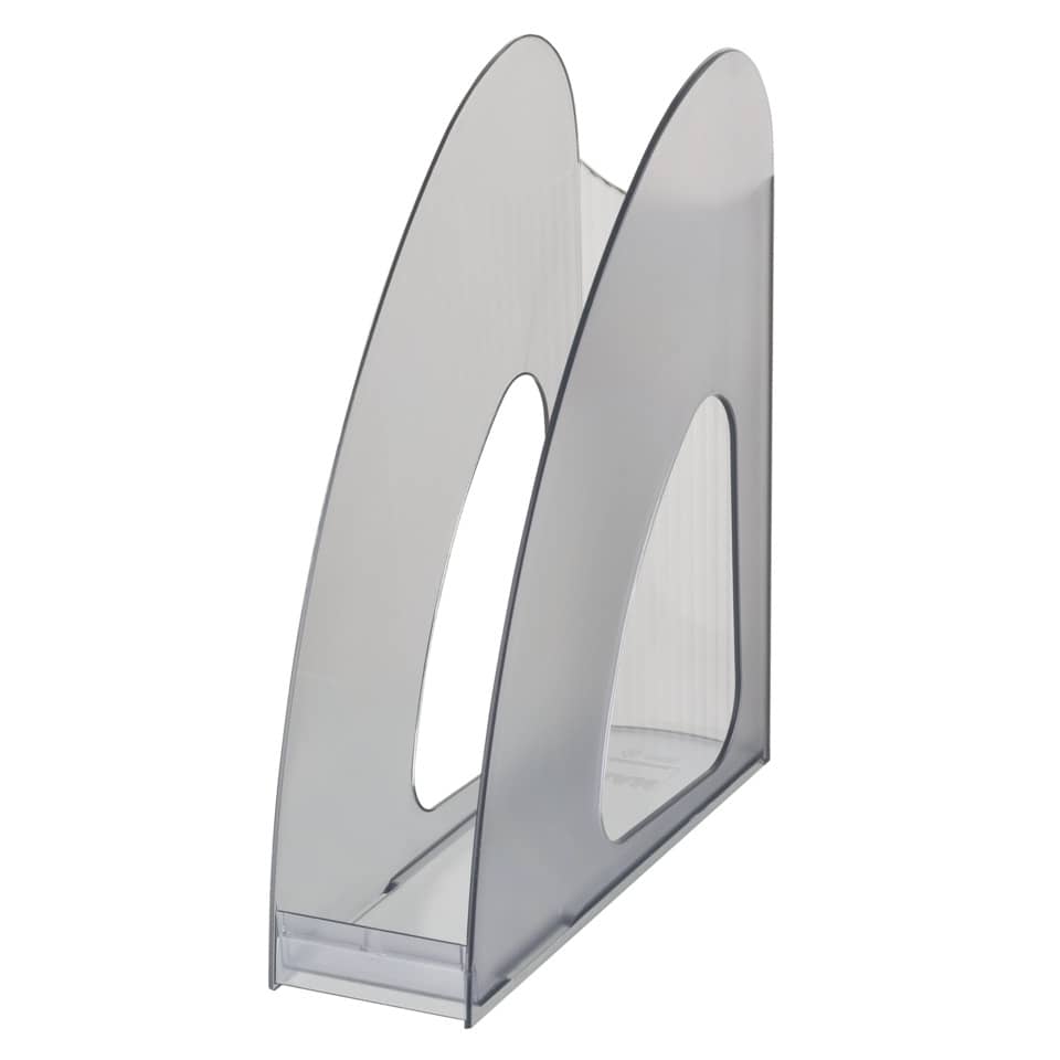 Stehsammler TWIN. Ideal zur Bestückung und Entnahme durch den niedrigen Rand. Verwendung für Papierformate bis C4. Material: hochwertiger, schwermetallfreier Kunststoff. Größe (B x H x T) : 76 x 26 x 239 mm. Höhe hinten: 257 mm. Farbe: transluzent-grau.