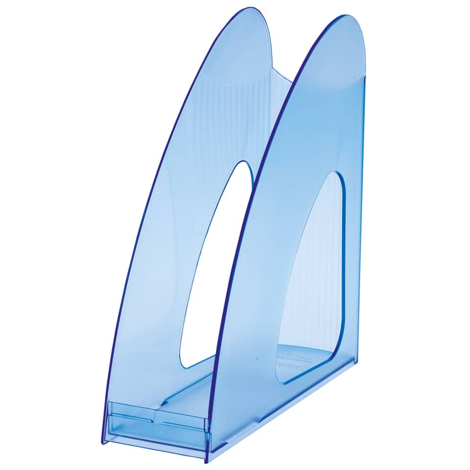 Stehsammler TWIN. Ideal zur Bestückung und Entnahme durch den niedrigen Rand. Verwendung für Papierformate bis C4. Material: hochwertiger, schwermetallfreier Kunststoff. Größe (B x H x T) : 76 x 26 x 239 mm. Höhe hinten: 257 mm. Farbe: transluzent-blau.