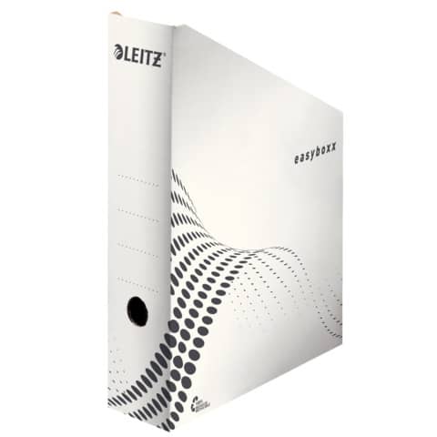 Leitz Archiv-Stehsammler easyboxx 80mm. Für DIN A4. Geeignet für Hoch- und Querformat. Mit Automatikboden für einen schnellen und bequemen Aufbau. Mit Beschriftungslinien. Für 700 Blatt Papier. Lieferung flach liegend. Material: 100% Wellpappe (RC), 100% recycelbar. Format Außenmaß: vorne 260 x 80 x 170 mm, hinten 260 x 80 x 320 mm. FSC®-zertifiziert. Farbe: weiß.