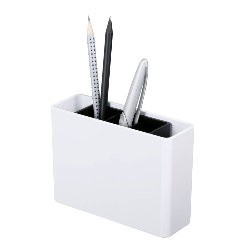 Stifteköcher smart-LINE, formschön und innovativ. Rechteckige Grundform mit abgerundeten Ecken. Hier sind Ihre Stifte gut aufbewahrt und schnell griffbereit. Der Einsatz mit 3 Fächern kann auch als Vase benutzt werden. Moderne, hochglänzende Farbe. Optionaler Zusatznutzen: Der integrierte Clip an der Unterseite ermöglicht es, den Stifteköcher an der Verbindungsschiene der Schreibunterlage ins optimale Blickfeld zu rücken. Die smart-Line Serie bietet die ideale Voraussetzung für die Organisation des modernen Arbeitsplatzes. Sie vereint auf ideale Weise die digitale und analoge Arbeitswelt. Anspruchsvolles Design und optimale Funktionalität zeichnen die gesamte Serie aus. Made in Germany. Außenmaße (B x T x H): 135 x 40 x 98 mm. Material: hochwertiger Kunststoff (ABS). Farbe des Stifteköchers: weiß. Farbe des Einsatzes: schwarz.