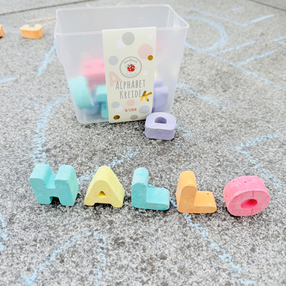 Mit der Alphabet Kreide wird das Malen im Freien noch kreativer! Diese Straßenmalkreide in Buchstabenform lässt Kinder spielerisch das Alphabet entdecken und ihre eigenen Kunstwerke auf der Straße oder dem Gehweg kreieren. Der fröhliche Pastellfarben-Mix sorgt für einen frischen, bunten Look. Die 36 Stück werden in einer praktischen Kunststoffbox mit Tragegriff geliefert, die sich ideal für unterwegs eignet.