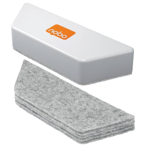 Nobo Tafelwischer magnethaftend. Löschfilz auswechselbar. Für die trockene Tafelreinigung. Für Whiteboards mit einer Oberfläche aus Emaille oder Stahl. Format: 89 x 34 x 219 mm. Farbe: weiß.
