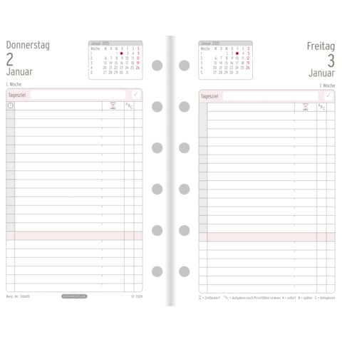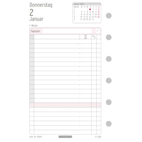 Kalendarium Tagesplan Mini 2025. Verwendung für Produkt: Chronoplan. Typbezeichnung: Mini. Verwendung für Kalenderjahr: 2025. Blattgröße (B x H) und Lochung: 95 mm, 145 mm, 6-Ring-Lochung. Packungsinhalt/Kalendarium: inkl. Jahresplan und zusätzliche Informationen, Formualare 80g/m² Papier, Jahresplan 120g/m² Papier/365 Tagespläne (1Tag/1 Seite).