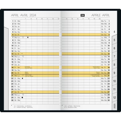 Modell M-Planer. 1 Monat auf 2 Seiten, Jahresübersicht aktuelles Jahr und Folgejahr, 2 Seiten Monatsplan November/Dezember Vorjahr und 3 Seiten Monatsplan Jänner bis Mai Folgejahr, mit auswechselbarem Adressheft 16 Seiten.Mit Registerschnitt, Kalenerschreibpapier chlorfrei gebleicht, Kalendereinlage auswechselbar. Einband Kunststoff.