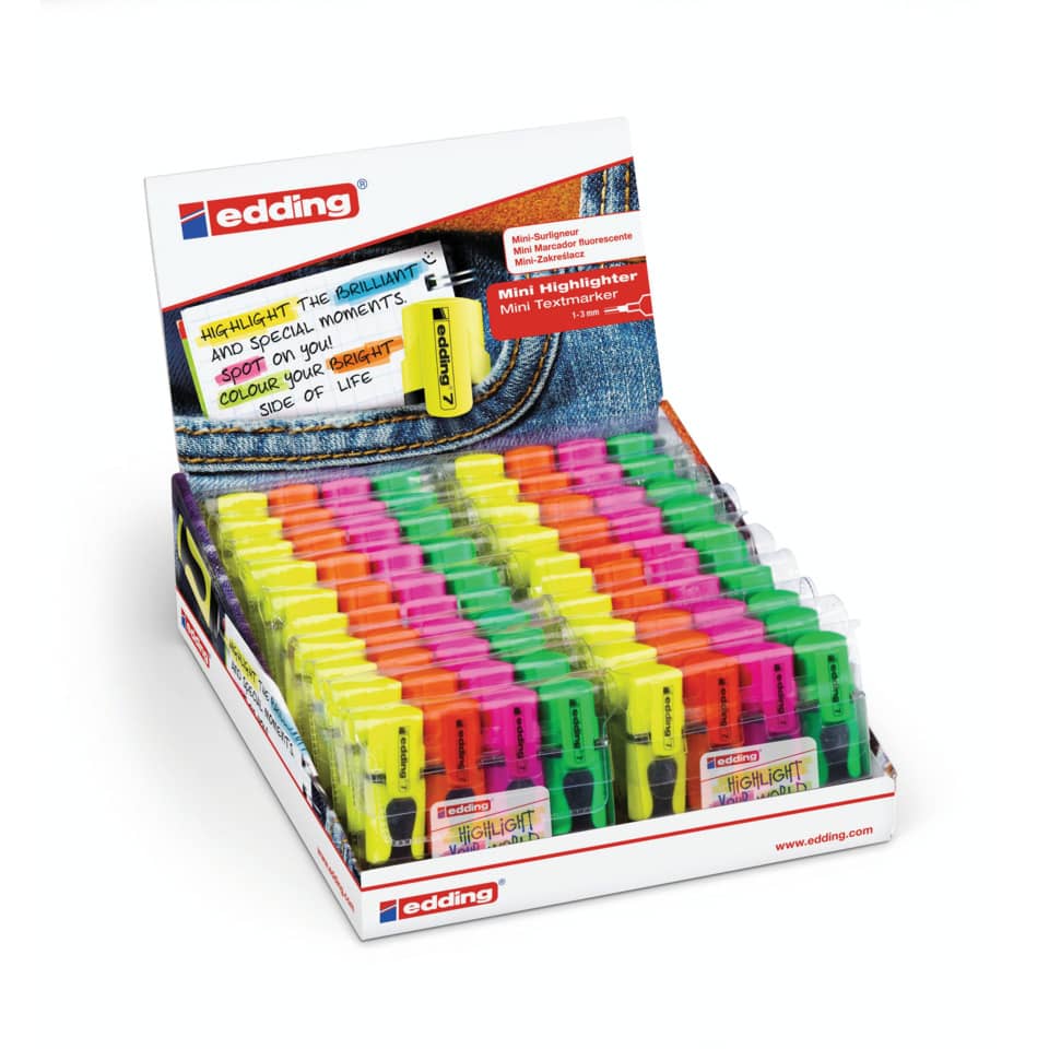 Leuchtkräftiger Textmarker im praktischen und trendigen Mini-Format. Die Keilspitze verfügt über eine Strichbreite von 1-3 mm. Tinte auf Wasserbasis, die nicht durch das Papier durchschlägt. Das Set enthält die leuchtenden Neonfarben Gelb, Orange, Pink und Grün. Die rutschfeste und ergonomische Griffzone sorgt für ein komfortables und angenehmes Markieren von Texten. Passt auch in die kleinste Tasche, ideal für unterwegs. In wiederverwendbarem Etui.