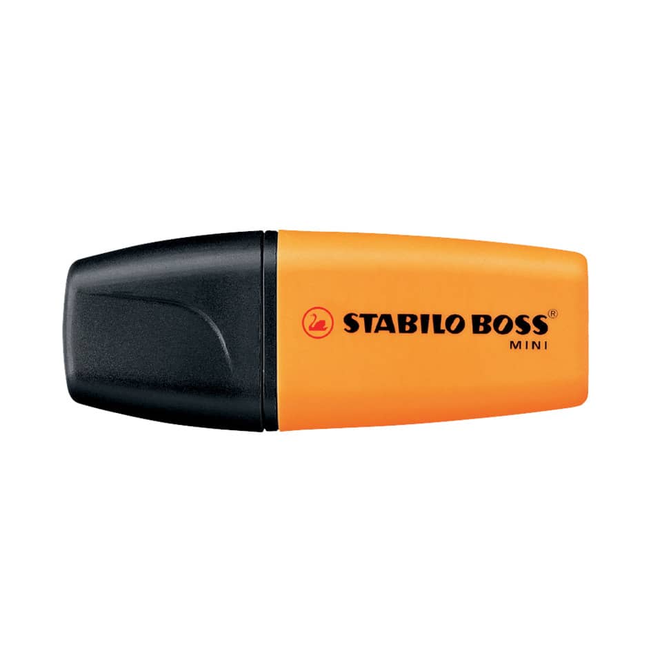 Textmarker STABILO® BOSS® MINI, Strichstärke: 2 + 5 mm, Art der Schreibflüssigkeit: geruchsfreie Tinte auf Wasserbasis, Tintenspeicher-Technik: Kapillarspeicher, STABILO Anti-Dry-Out Technology: 4 Stunden Austrocknungsschutz für konzentriertes Arbeiten. Passt in die kleinste Tasche, Farbe des Schaftes: in Schreibfarbe, Farbe: orange.