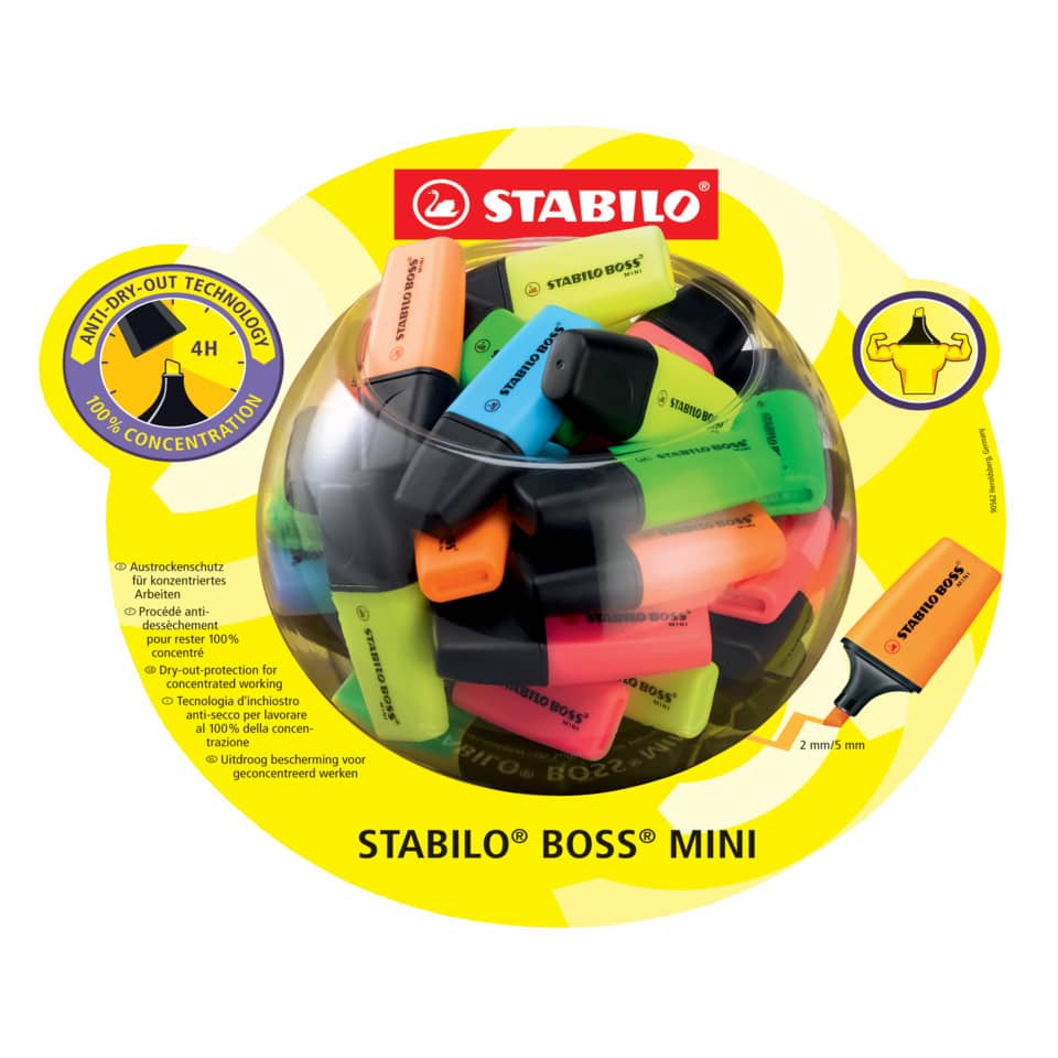 Textmarker STABILO® BOSS® MINI Bonbonglas. Ausführung des Inhalts des Displays: sortiert in 5 Leuchtfarben: 15 Stück gelb, je 10 Stück grün und orange, 8 Stück pink, 7 Stück blau. STABILO Anti-Dry-Out Technology: 4 Stunden Austrocknungsschutz für konzentriertes Arbeiten. Passt in die kleinste Tasche. Material des Displays: Kunststoff. Größe (B x H x T): 210 x 120 x 180 mm. Farbe: gelb/transparent.