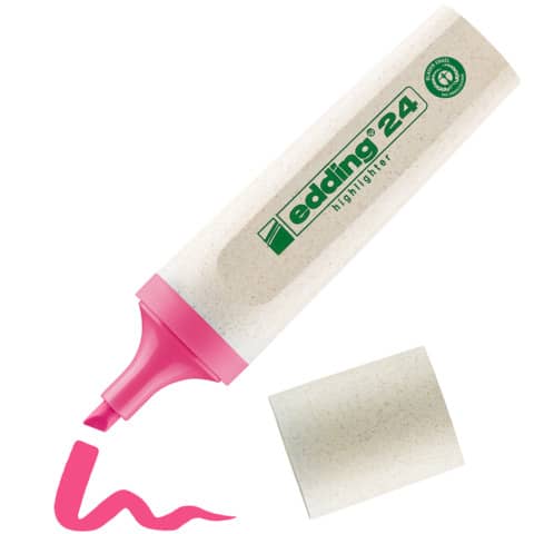 Textmarker Highlighter 24 EcoLine. Nachfüllbarer Textmarker. Inkjet geeignet. Wassergelöste Tinte mit hoher Farbbrillanz. Keilspitze. Kappe und Schaft mindestens zu 90 % aus nachwachsendem Rohstoff. Mundstück mindestens zu 97 % aus recyceltem Material. Filterfasern aus recyceltem Material. Mundstück in Schreibfarbe. Kappe und Schaft im Holzlook. Strichstärke: 2-5 mm. Farbe: rosa.