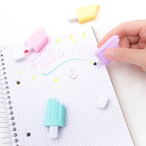 Kolorieren, schattieren und hervorheben! Diese trendigen Pastell-Highlighter in süßer Eisform im 4er Set eignen sich besonders gut, um farbliche Akzente zu setzen. Das praktische Aufbewahrungs-Etui macht es leicht, die Stifte immer sofort griffbereit zu haben. Mit praktischer Keilspitze.Erhältlich in 2 verschiedenen Varianten in je 4 Farben: gelb, pink, türkis, lilaGrößen: Eis am Stiel ca. 2,6 x 6,0 x 1,2 cm, Eis in der Waffel ca. 2,1 x 6,0 x 2,1 cm