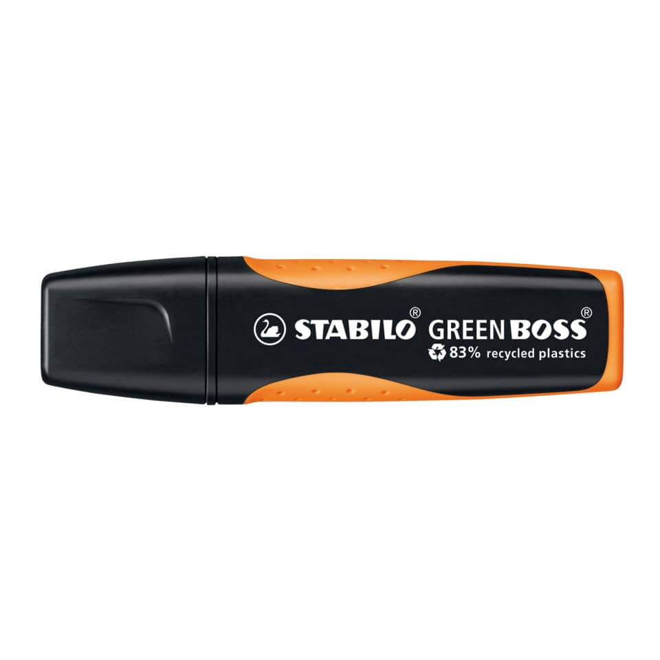 Textmarker STABILO® GREEN BOSS®, nachfüllbar, Strichstärke: 2 + 5 mm, Art der Schreibflüssigkeit: geruchsfreie Tinte auf Wasserbasis, Tintenspeicher-Technik: Kapillarspeicher, hergestellt aus 83 % recyceltem Kunststoff. Stylisches Design mit rutschfester Griffzone. STABILO Anti-Dry-Out Technology: 4 Stunden Austrocknungsschutz für konzentriertes Arbeiten, Farbe des Schaftes: schwarz mit Schreibfarbe, Farbe: orange.