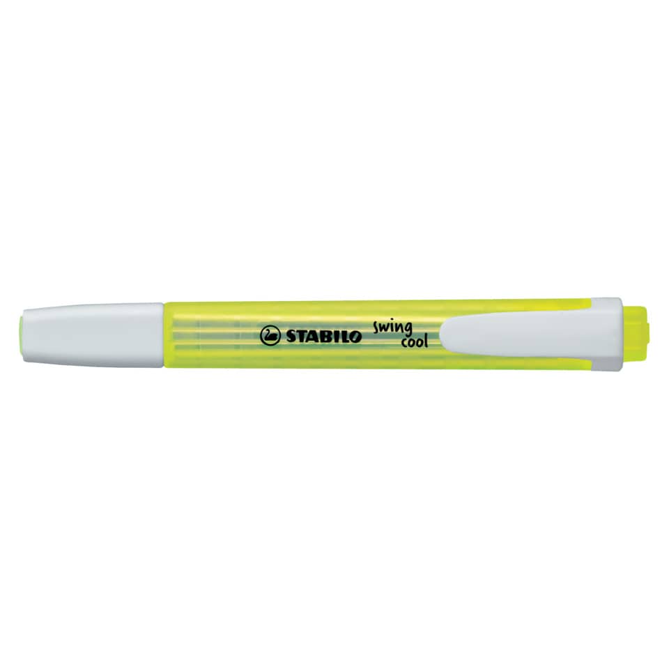 Textmarker STABILO® swing® cool. Schattenfrei kopierbar. Strichstärke: 1 + 4 mm. Art der Schreibflüssigkeit: geruchsfreie Tinte auf Wasserbasis. Tintenspeicher-Technik: Tamponspeichersystem. STABILO Anti-Dry-Out Technology: 4 Stunden Austrocknungsschutz für konzentriertes Arbeiten. Farbe des Schaftes: in Schreibfarbe. Clip vorhanden. Farbe: gelb.