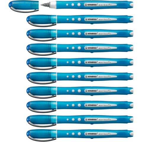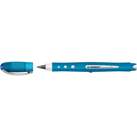 Tintenroller STABILO® worker®+ colorful, Kappenmodell, Typbezeichnung der Mine: Rollerballmine, Art der Schreibflüssigkeit: Tinte auf Wasserbasis, Ausführung Mine: unverwüstliche Spitze (aus Neusilber) gleitet rasant über das Papier, 0,5 mm, blau, kann einige Tage offen liegen bleiben, ohne einzutrocknen, Tintenspeicher-Technik: Free Ink System, Ausführung Stift: Polypropylen, rutschfeste Oberfläche auf dem gesamten Schaft, Material des Clips: Metall, Kappe am Stiftende aufsteckbar, Farbe des Schaftes: blau.