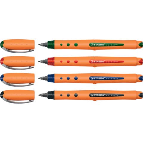 Tintenroller STABILO® worker®+ fine, Kappenmodell, Typbezeichnung der Mine: Rollerballmine, Art der Schreibflüssigkeit: Tinte auf Wasserbasis, Ausführung Mine: unverwüstliche Edelstahlspitze gleitet rasant über das Papier, 0,3 mm, blau, kann einige Tage offen liegen bleiben, ohne einzutrocknen, Tintenspeicher-Technik: Free Ink System, Ausführung Stift: Polypropylen, rutschfeste Oberfläche auf dem gesamten Schaft, Material des Clips: Metall, für ein sanftes Schreibgefühl. Tintenstand-Kontrolle. Kappe am Stiftende aufsteckbar, Farbe des Schaftes: orange.