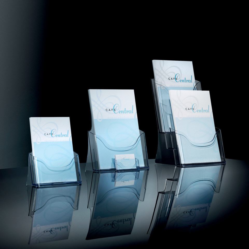 Tisch-Prospekthalter, 1 Visitenkartenfach, aus hochwertigem, glasklarem Acryl-Material, passend für das Format DIN A4 (210x297 mm), mit einer Fülltiefe von 30 mm (Produkt-Außenmaß 24 x 29 cm). Mit praktischem Zusatzfach für 60 Visitenkarten Form follows function: Dieser Prospekthalter überzeugt durch formvollendetes Design, das die ausgestellten Broschüren, Zeitschriften, Kataloge oder Flyer optimal präsentiert. Das hochwertige Acryl-Material kombiniert die Eleganz und Schönheit von Glas mit der Leichtigkeit und Bruchsicherheit eines Kunststoffes. Hohe UV-Beständigkeit ist ein weiterer Pluspunkt, genauso wie das stärkere und dadurch stabilere Material. Dank weicher Linienführung und klarer Transparenz harmoniert der Prospekthalter in jedem Ambiente und ermöglicht fast unbegrenzten Einsatz. Pfiffig: Verschiedene Formate lassen sich perfekt miteinander kombinieren.
