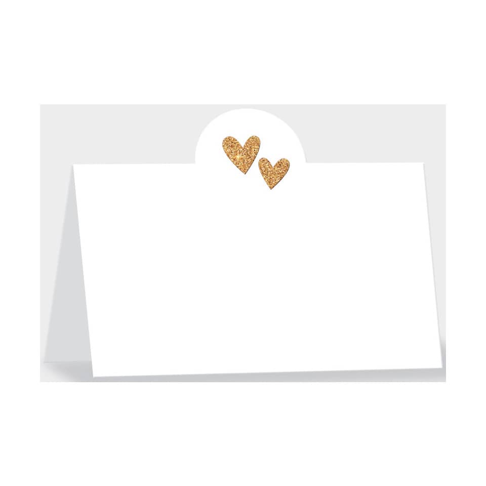 Tischkarten mit filigraner Goldglimmerveredelung und Stanzung Format: 11x4,5cm geschlossen Motiv: zwei Herzen / Inhalt: 6 Stück