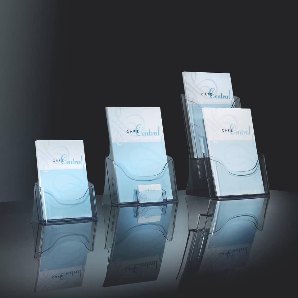 Tisch-Prospekthalter, 1 Fach, aus hochwertigem, glasklarem Acryl-Material, passend für das Format DIN A5 (148x210 mm), mit einer Fülltiefe von 30 mm (Produkt-Außenmaß 17 x 20 cm). Form follows function: Dieser Prospekthalter überzeugt durch formvollendetes Design, das die ausgestellten Broschüren, Zeitschriften, Kataloge oder Flyer optimal präsentiert. Das hochwertige Acryl-Material kombiniert die Eleganz und Schönheit von Glas mit der Leichtigkeit und Bruchsicherheit eines Kunststoffes. Hohe UV-Beständigkeit ist ein weiterer Pluspunkt, genauso wie das stärkere und dadurch stabilere Material. Dank weicher Linienführung und klarer Transparenz harmoniert der Prospekthalter in jedem Ambiente und ermöglicht fast unbegrenzten Einsatz. Pfiffig: Verschiedene Formate lassen sich perfekt miteinander kombinieren.
