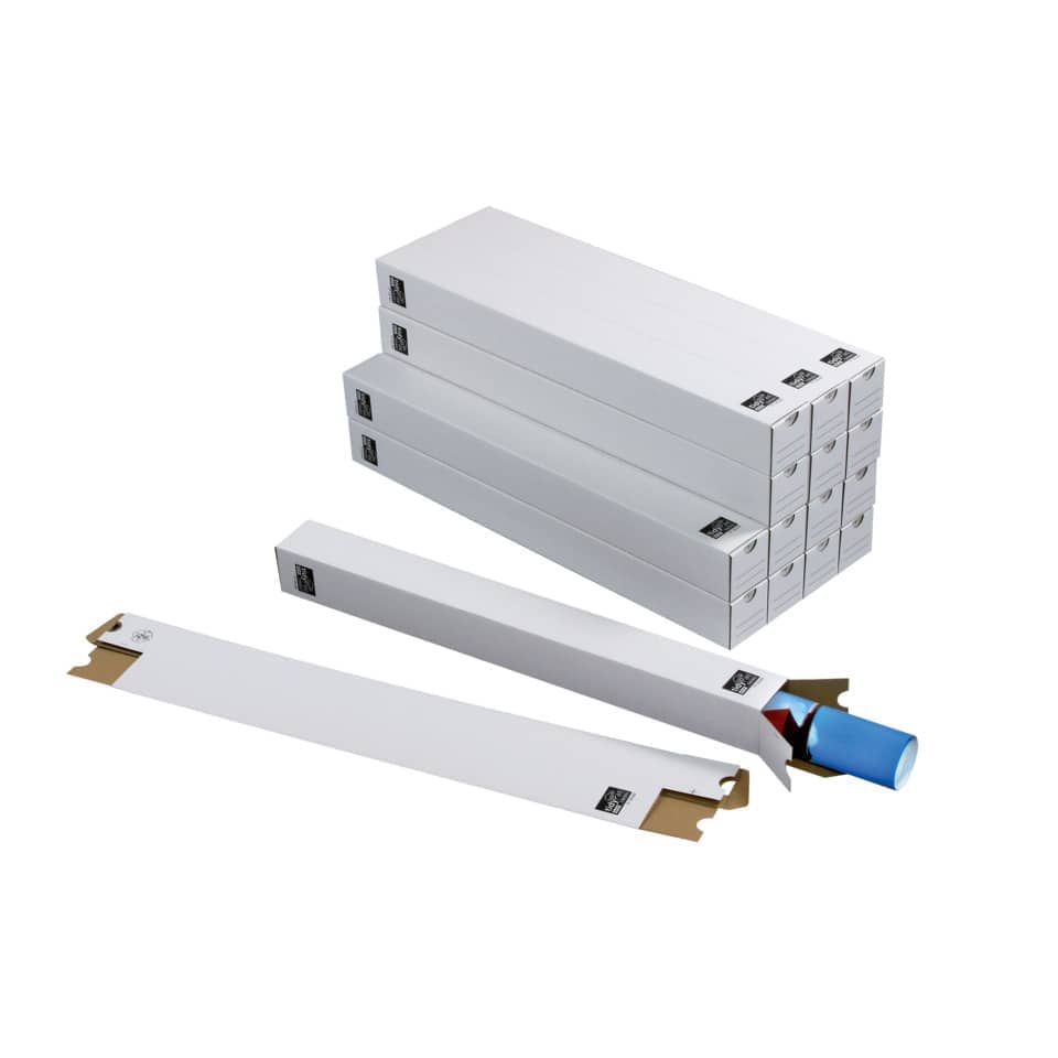 Versandverpackung und Archivbox aus festem Wellkarton für gerollte Güter. Mit Beschriftungsfeld und Kontrollsystem auf der Seitenlasche. Gut stapelbar. Farbe: weiß. Lieferung flachliegend. Außenmaß (BxHXL)ca. : 78x78x1105 mm