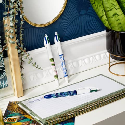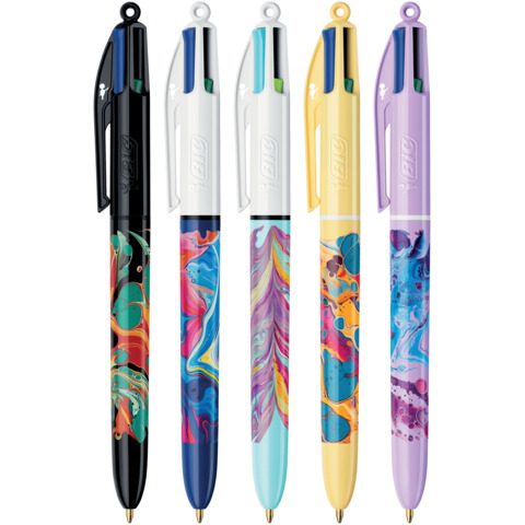 Vierfarbkugelschreiber BIC® 4 Colours® Decors. Druckmechanik. Ausführung Mehrfarbkugelschreiber: 4 Minen in blau, schwarz, rot, grün. Ausführung Mine: dokumentenecht (ISO 12757-2, Blau, Schwarz und Grün), 0,4 mm, Mine auswechselbar. Ausführung Stift: Kunststoff. Ausführung Clip: Kunststoff, weiß. Drücker zur Farbauswahl. Mit Aufhängöse. Farbe des Schaftes: 6 Designs sortiert.