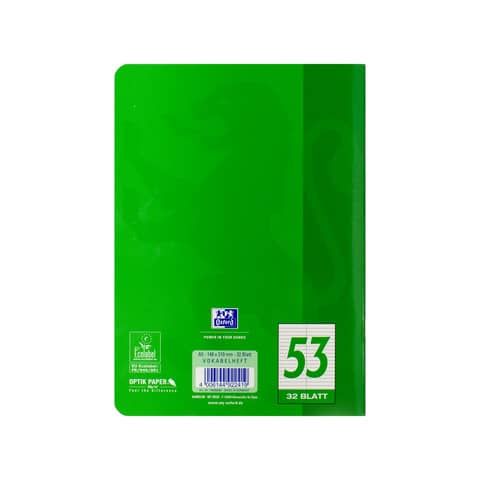 A5 Vokabelheft, geheftet, 32 Blatt. OPTIK PAPER® für leichtes Schreiben und optimale Schreibergebnisse. Spezielle Aufteilung in 2 Spalten (Lineatur 53) für eine gute Übersicht beim Lernen von Vokabeln. Extra robuster, veredelter Umschlag für dauerhaft optimale Nutzung. Mit Löschblatt um überschüssige Tinte aufzunehmen. Rückendraht geheftet um alle Seiten optimal beschreiben zu können. Durch umweltverträgliche Herstellung & Produktgüte ausgezeichnet mit dem anerkannten EU - Ecolabel.