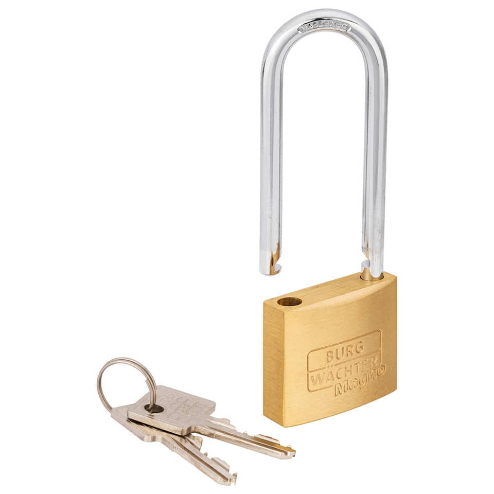 400 E Magno mit kompaktem MessingkorpusDer Export-Schlager - das bewährte Allround-Talent: Mit Messingkorpus, gehärtet und verchromt oder als Das BURG-WÄCHTER Vorhangschloss 400 E Magno mit kompaktem Messingkorpus. Der Export-Schlager - das bewährte Allround-Talent: Mit Messingkorpus, gehärtet und verchromt oder als Edelstahl-Variante, mit Edelstahlbügel ist es vielseitig einsetzbar. 400 E Magno - mit kompaktem Messingkorpus. Gehärtet und verchromt. Doppelt verriegelt ab Größe 30 mm. Innenteile nicht-rostend. Hohe Zerreißfestigkeit. Hohe Anzahl verschiedener Schließungen. Gleichschließend (Lagerware) ohne Aufpreis.as Schloss trotzt über lange Zeit Wind und Wetter. Dafür sorgen die rostresistenten Innenteile vom Magno. So ist stets eine korrekte Schließung des Zylinders möglich. Apropos Schließung: Das Vorhängeschloss Magno gibt es in einer hohen Anzahl unterschiedlicher Schließungen. Damit nicht durch Zufall ein anderer Schlüssel in Ihr Schloss passt. Wer mehrere Magno Vorhängeschlösser im Einsatz hat, der sollte die gleichschließende Variante wählen. Denn so öffnen Sie alle Schlösser ganz komfortabel mit einem Schlüssel. Damit hat das Suchen und Probieren bis zum Finden des richtigen Schlüssels endlich ein Ende. HB = Mit hohem Bügel