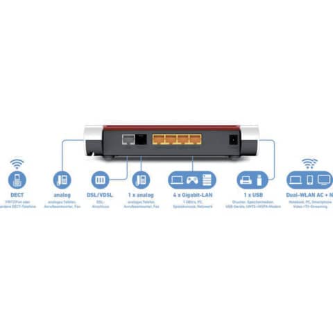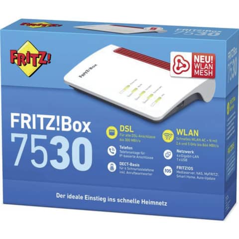 Die FRITZ!Box 7530 bringt das High-Speed-Heimnetz an jeden DSL-Anschluss und wird mit einer Fülle an Extras höchsten Ansprüchen gerecht. Die FRITZ!Box unterstützt mit VDSL-Supervectoring 35b den neuen Standard für Übertragungsleistungen von bis zu 300 MBit/s (z. B. aktuelle Tarife der Deutschen Telekom oder Vodafone mit bis zu 250 MBit/s). Damit verdreifacht sich die Geschwindigkeit am DSL-Anschluss und Downloads riesiger Datenpakete erfolgen in Rekordgeschwindigkeit. Produktbeschreibung FRITZ!Box 7530 im Überblick: Geeignet für alle IP-basierten Anschlüsse (ADSL und VDSL). Internet-Geschwindigkeit von bis zu 300 MBit/s durch VDSL-Supervectoring 35b. Sichere Internetnutzung durch voreingestellte Firewall. Mehr Performance, Flexibilität und stabilste Verbindungen durch gleichzeitiges WLAN AC + N (Dualband). VoIP-Telefonanlage mit vielseitigen Komfortfunktionen für Analog-, DECT- und IP-Telefone). DECT-Basis für bis zu 6 Schnurlos-Telefone (z. B. alle FRITZ!Fon Modelle) sowie für schaltbare Steckdosen und Heizkörperregler FRITZ!DECT. Einfache, deutschsprachige Benutzeroberfläche für sämtliche Einstellungen. Bereitstellung von Musik, Filmen und Bildern über integrierten Mediaserver, z.B. am Smart TV. Mit MyFRITZ! von überall auf der Welt sicherer Zugriff auf FRITZ!Box und Netzwerkspeicher. 1 Leistungsstarker USB-Anschluss für Speichermedien (NAS), Netzwerkdrucker und Mobilfunksticks.4 ultraschnelle Gigabit-LAN-Anschlüsse für Computer, Fernseher und andere Netzwerk-Geräte. 1 analoger Telefon-Anschluss. Lieferumfang: FRITZ!Box 7530, DSL-Kabel, (ca. 4,25m), LAN-Kabel, (ca. 1,5m), Netzteil und Installationsanleitung.
