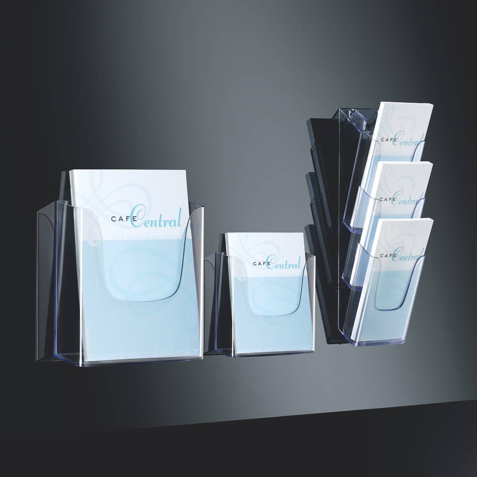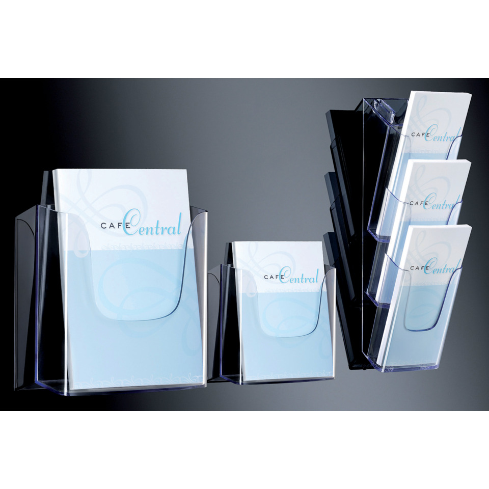 Wand-Prospekthalter, 1 Fach, aus hochwertigem, glasklarem Acryl-Material, passend für das Format DIN A5 (148x210 mm), mit einer Fülltiefe von 45 mm (Produkt-Außenmaß 17 x 15,5 cm). Form follows function: Dieser Prospekthalter überzeugt durch formvollendetes Design, das die ausgestellten Broschüren, Zeitschriften, Kataloge oder Flyer optimal präsentiert. Das hochwertige Acryl-Material kombiniert die Eleganz und Schönheit von Glas mit der Leichtigkeit und Bruchsicherheit eines Kunststoffes. Hohe UV-Beständigkeit ist ein weiterer Pluspunkt, genauso wie das stärkere und dadurch stabilere Material. Dank weicher Linienführung und klarer Transparenz harmoniert der Prospekthalter in jedem Ambiente und ermöglicht fast unbegrenzten Einsatz. Pfiffig: Verschiedene Formate lassen sich perfekt miteinander kombinieren.