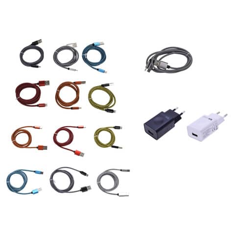 24x Nylonladekabel Lightning in 6 Farben sortiert, 24x Nylonkabel Typ USB-C in 6 Farben sortiert, 24x Nylonkabel 3in1 silber , 24x USB-Netzladestecker schwarz oder weiß. Sortiert in verschiedene Farben.